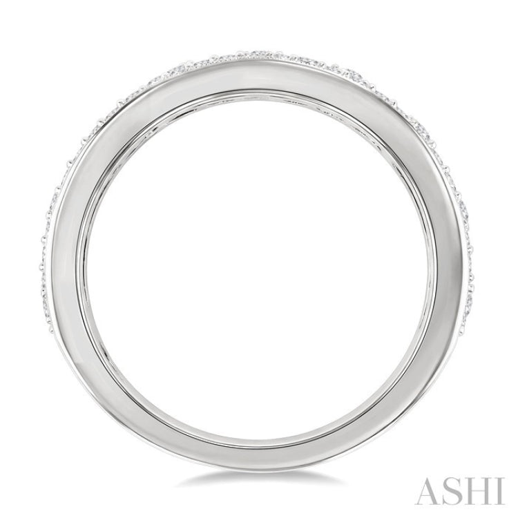 An intricately styled diamond wedding band, this offers an exclusive look that sets it apart from the traditional wedding band. It features a row of 8 wide and 9 thin rectangular channels all along the center of the ring. These channels are set with round cut diamonds. While the wider ones are embellished with a large round cut diamond each, total 8, the thinner ones are decorated with 2 each round cut diamonds, total 18. 29 each, total 58, pave set round cut diamonds form a border on either side. A milgrain finish is seen on the borders and the channels. The wedding band is styled in 14 karat white gold. Total diamond weight is 1 1/10 Ctw.