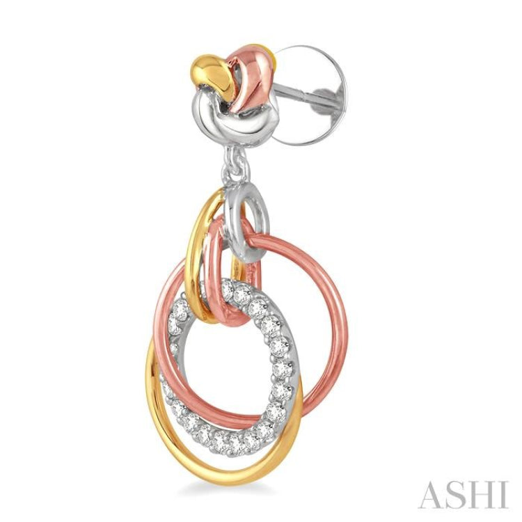 These incredible 14 karat tri color multi circle earrings are perfect to make your beloved smile with joy. Lustrous white, pink and yellow gold intricately designed circles are graced with 44 dazzling round cut diamonds in pave setting. These earrings are closed with secure clasp. Total diamond weight is 1/3 Ctw.