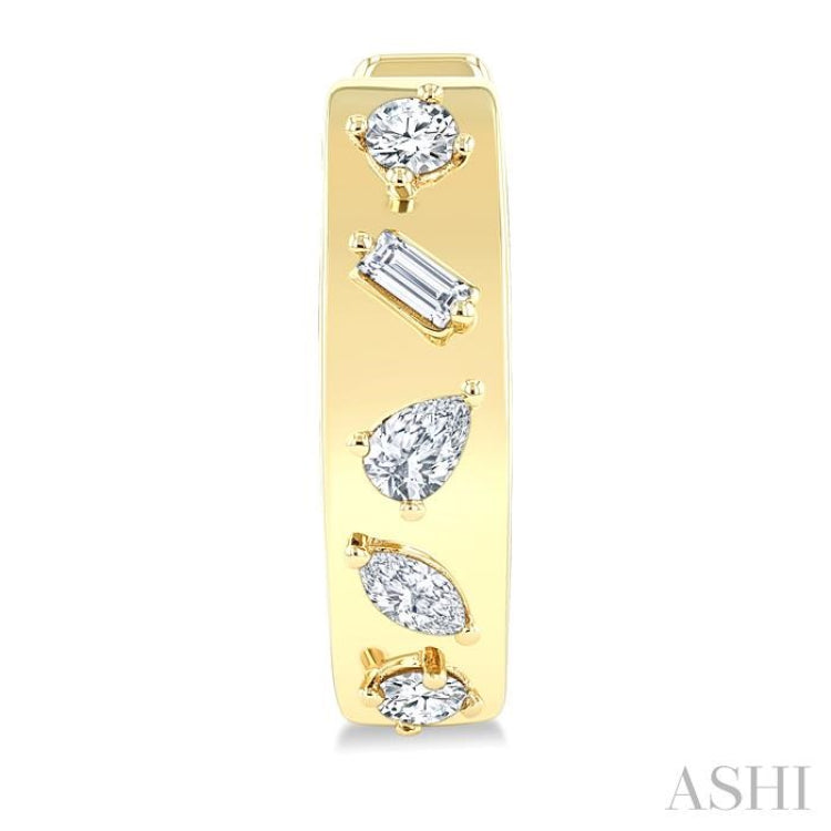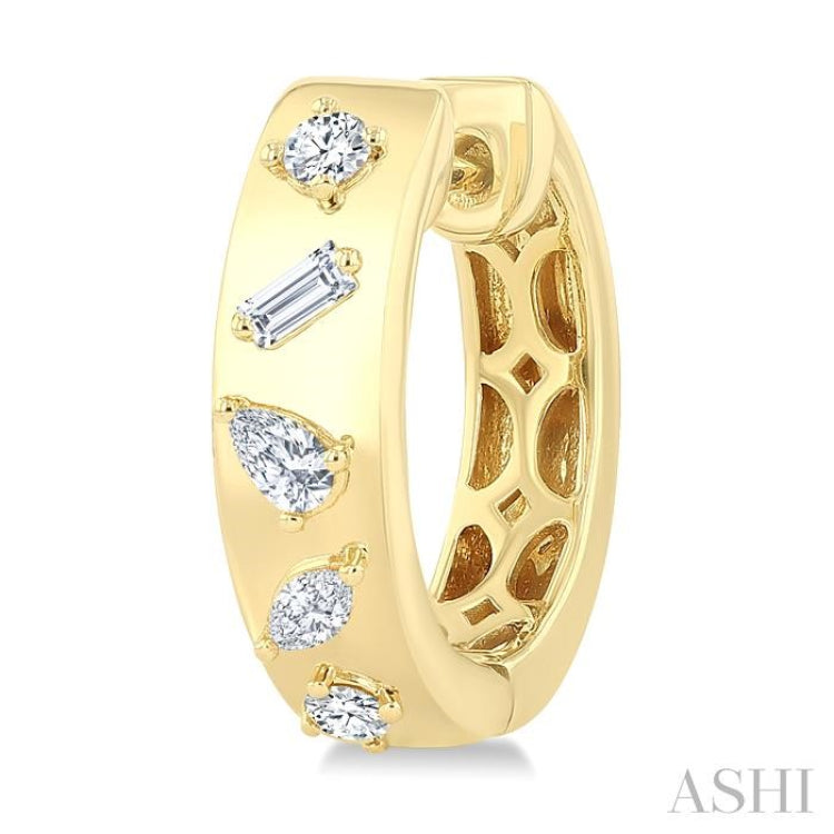 Showcase a brilliant fusion of shapes with these fashion hoop earrings, where a marquise, pear, and baguette cut diamond each line the center of the hoop, framed on either end by sparkling round cut diamonds. This playful mix of diamond cuts creates a dynamic sparkle that shifts with every movement. Lever-back clasps provide a secure fit, while the 14 karat yellow gold body enhances the shine and elegance of each stone. With a total diamond weight of 1/3 Ctw, these fashion hoop earrings turn a classic design into a striking, contemporary statement.
