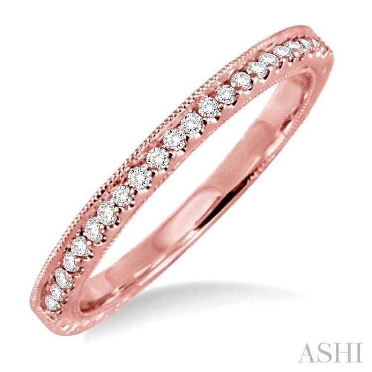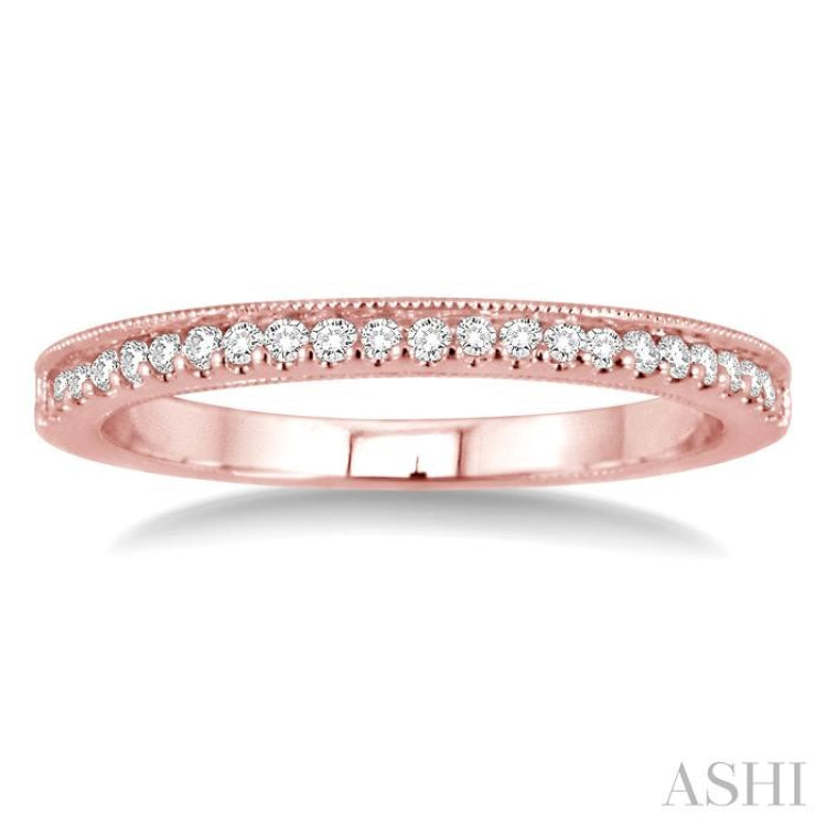 Bind your love for her with the splendor of this Diamond Wedding Band fashioned in luminous 14 karat rose gold. This diamond band showcases a delicate row of 22 glittering round cut diamonds, gracefully pave set. Total diamond weight is 1/6 Ctw.